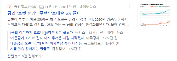 안타까운 상황은 은행권은 당장 18일부터 인상된 코픽스 금리를 신규 주담대(주택담보대출) 변동금리에 반영한다는 계획이라는 것입니다. 때문에 엄청난 대출로 영혼까지 끌어모아 집을 산 영끌족들은 부담이 될 수 밖에 없겠네요..