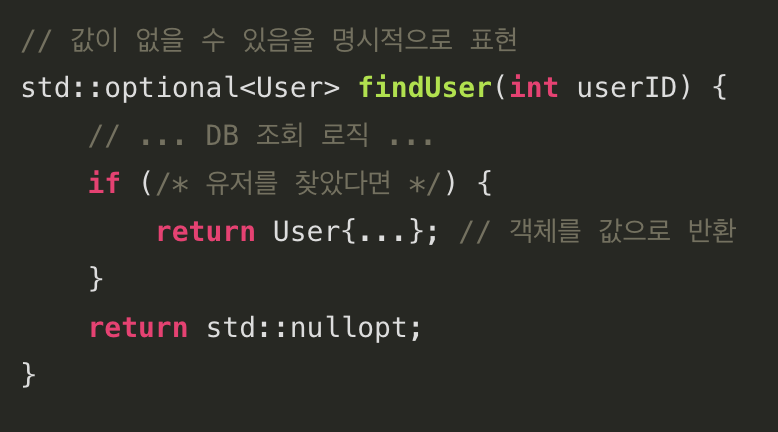 함수 시그니처 std::optional<std::string>만 봐도 이제 이 함수가 문자열을 반환할 수도 있지만, 아닐 수도 있다는 사실을 컴파일러와 개발자 모두에게 명확하게 알려준다. 더 이상 nullptr인지 아닌지, 반환값이 -1인지 아닌지 걱정할 필요가 없다.