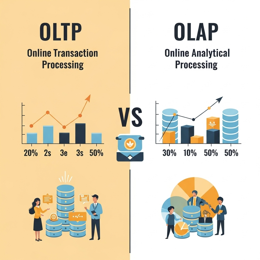 - OLTP (Online Transaction Processing): 우리가 흔히 쓰는 관계형 데이터베이스(RDBMS)가 여기에 속한다. 쇼핑몰의 '주문 처리'를 생각하면 쉽다. 수많은 사용자들이 동시에 상품을 주문하고, 재고를 확인하며, 결제하는 등 작고 빠른 '트랜잭션'이 실시간으로 일어난다. 데이터를 쓰고, 읽고, 수정하고, 삭제하는 작업(CRUD)에 최적화되어 있다.