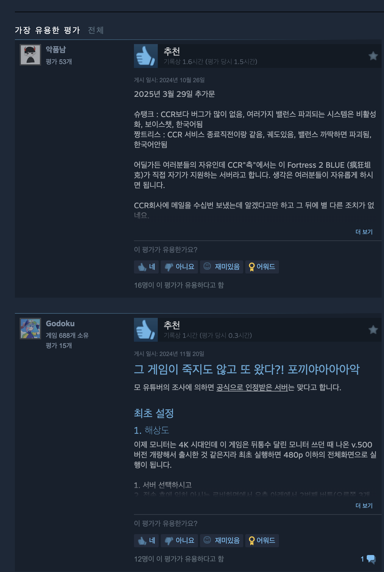 문득 든 생각에 곧바로 스팀(Steam)을 켜고 'Fortress 2'를 검색했다. 설마 있겠어? 그런데, 있었다. 'Fortress 2 BLUE'라는 이름으로. 심장이 잠시 두근거렸다. 내 추억의 게임이, 2025년에 스팀에 떡하니 존재하다니. 당장 '설치' 버튼을 누르려던 찰나, 무언가 이상한 점이 눈에 띄었다.