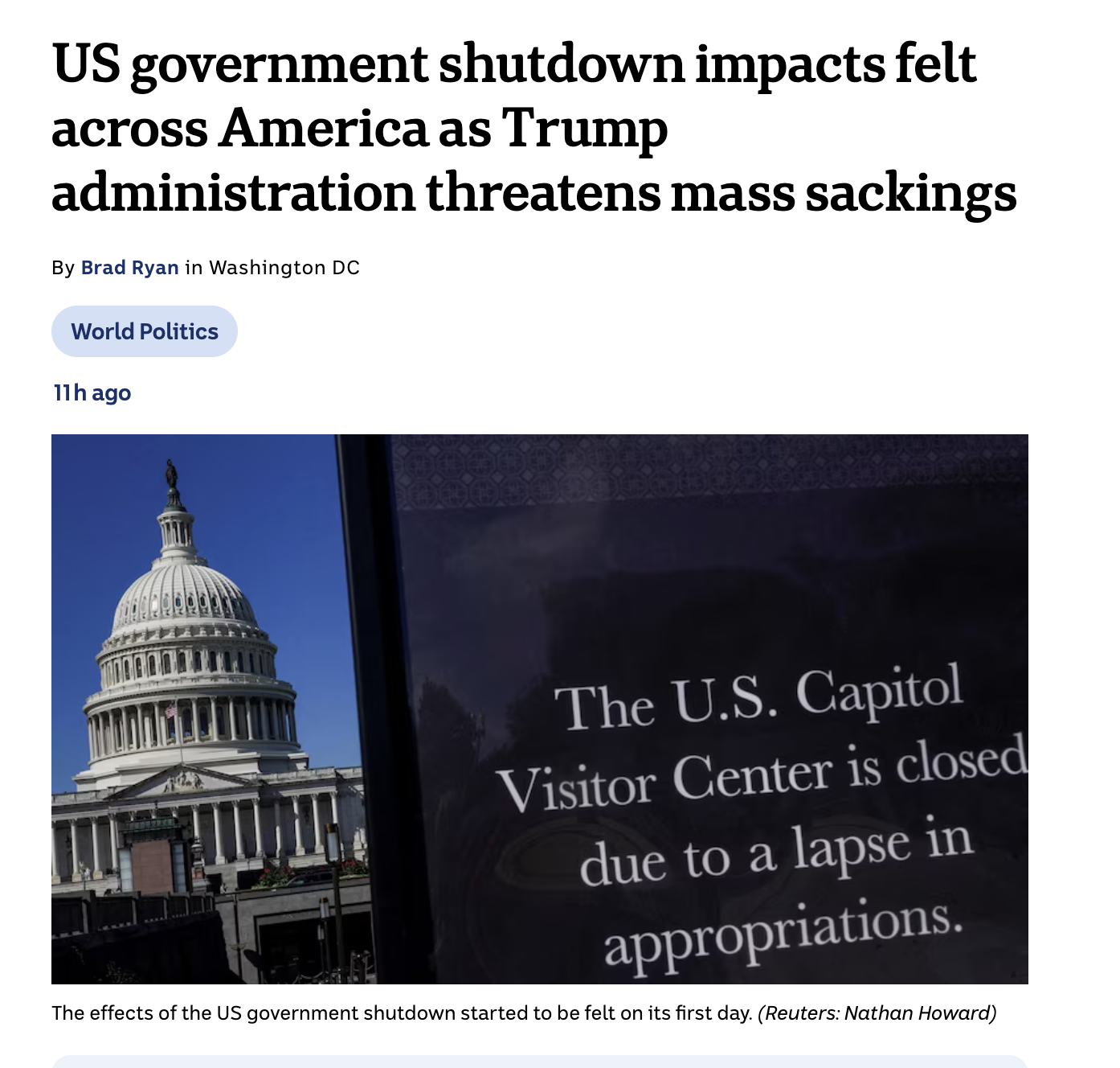 물론 국방, 경찰, 소방, 항공 관제처럼 국가 운영에 필수적인 업무는 유지된다. 하지만 이런 필수 인력들도 예산안이 통과될 때까지는 무급으로 일해야 하는 경우가 많다. 그 외 국립공원, 박물관, 일부 행정 서비스 등 비필수적인 업무는 모두 중단된다.