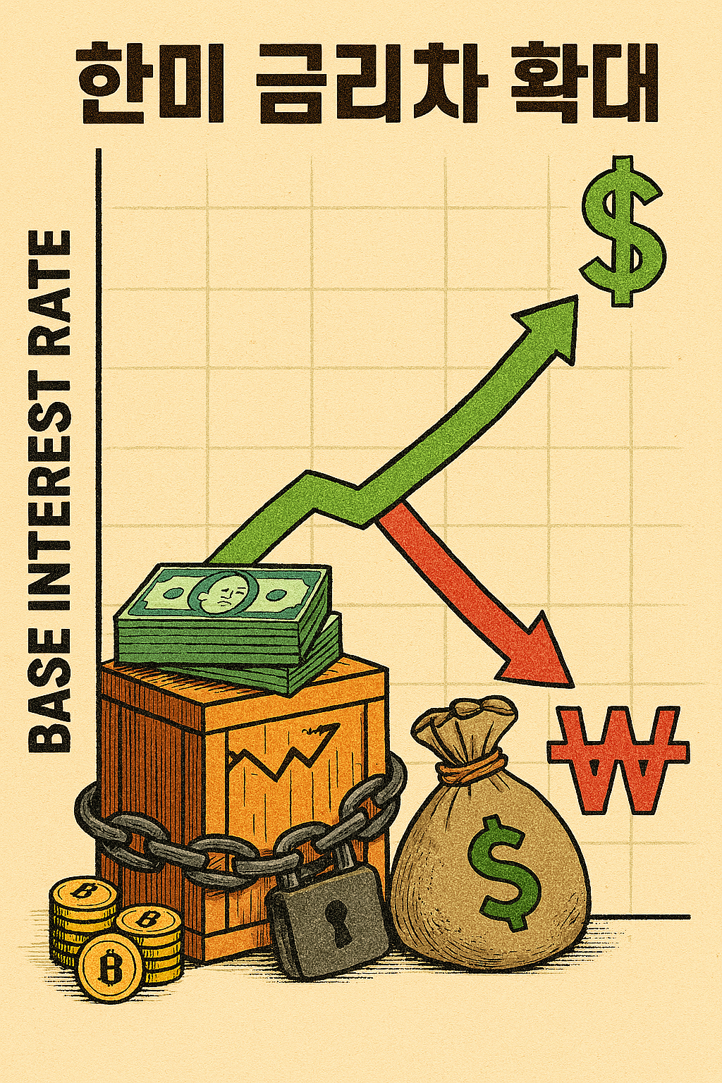 이것도 중요한 요인이다. 미국은 여전히 높은금리를 유지하고있는데 한국은 금리를 낮추고있으니까 금리차가 벌어진다.