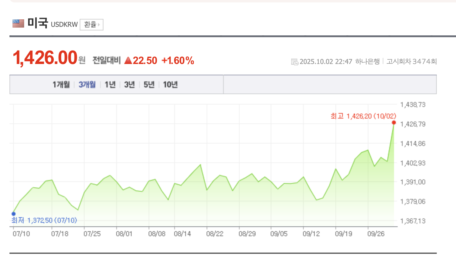 2025년 10월 기준으로 원달러 환율은 1,410~1,416원 사이에서 움직이고 있다. 10월 6일 기준으로는 1,410.92원을 기록했는데, 전 거래일 대비 0.24% 오른 수치다.
