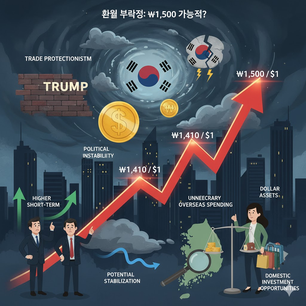 환율이 1,410원을 넘어선 지금, 1,500원 돌파가 현실이 될수도있다는게 실감이난다. 트럼프 정부의 보호무역 정책, 국내 정치 불안, 한미 금리차 확대 등 여러 요인이 복합적으로 작용하고있다.